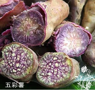 五彩薯是近年培育出的蕃薯新品種,肉質細滑,清香可口,加之色澤五彩斑斕,很是吊人胃口。