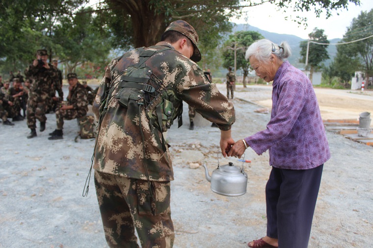 2019年1月5日,武警陽江支隊機動中隊官兵參加冬季野營拉練,中途休息時,好心老婆婆為支隊官兵送上一壺熱水
