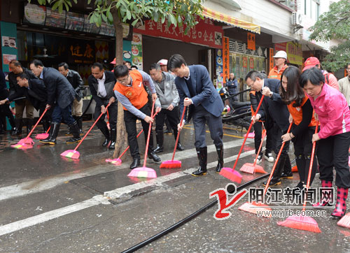 上午11時左右,溫湛濱等市政府領導班子成員與市直機關干部來到東源市場,與江城區干部、街道社區負責人及社區掛點單位干部職工、市公安消防局官兵、武警陽江市支隊官兵、志愿者和環衛工人共100多人,一起參加市區愛國衛生專項大清掃活動。大家分工合作,配合默契,溫湛濱等拿起掃帚清掃街道,有的用清洗液反復擦洗地面污垢,有的用水槍沖洗地面。經過半個多小時的辛勤勞動,東源市場門前長約300米的街道很快變得干凈整潔了。