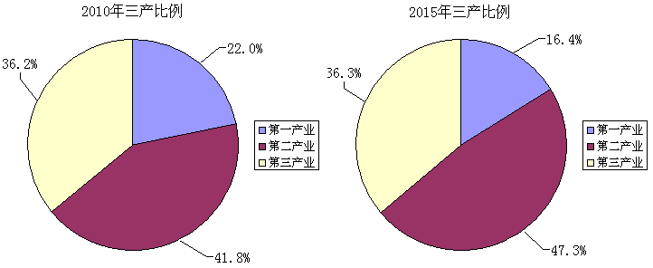 2015年,全市實現地區生產總值(GDP)1250.01億元,同比增長8.5%,其中第一產業、第二產業和第三產業增加值分別增長3.5%、9.9%和 8.6%。三大產業比例由上年同期的16.5:48.0:35.5調整為16.4:47.3:36.3。三大產業對GDP的貢獻率分別為6.1%、60.0%和33.9%,分別拉動全市GDP增長0.5個百分點、5.1個百分點和2.9個百分點。