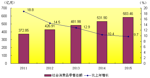全年社會消費品零售總額583.46億元,同比增長9.7%。從地域看,城鎮實現零售額455.41億元,增長9.7%;農村實現零售額128.05億元,增長9.5%。從分行業看,批發零售貿易業零售額524.98億元,增長9.8%;住宿和餐飲業零售額58.48億元,增長8.5%。