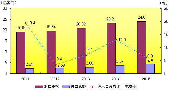 全年進出口總額28.6億美元,同比增長6.3 %。其中,出口24.0億美元,增長3.6%;進口4.5億美元,增長23.4%。全年實際利用外商直接投資0.85億美元,同比下降27.5%。新簽利用外資合同27宗,同比下降32.5%;合同利用外資2.07億美元,下降72.8%,平均每個合同協議利用外資765萬美元,減少1132萬美元。截至2015年底,全市登記注冊的外商投資企業540家,其中本年登記的外商投資企業36家。