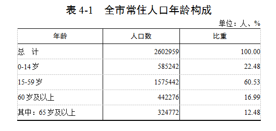 全市常住人口[2]中,0-14歲[3]人口為585241人,占22.48 %;15-59歲人口為1575442人,占60.53 %;60歲及以上人口為442276人,占16.99 %,其中65歲及以上人口為324772人,占12.48 %。與2010年第六次全國人口普查相比,0-14歲人口的比重提高4.16個百分點,15-59歲人口的比重下降7.29個百分點,60歲及以上人口的比重提高3.13個百分點,65歲及以上人口的比重提高2.36個百分點。