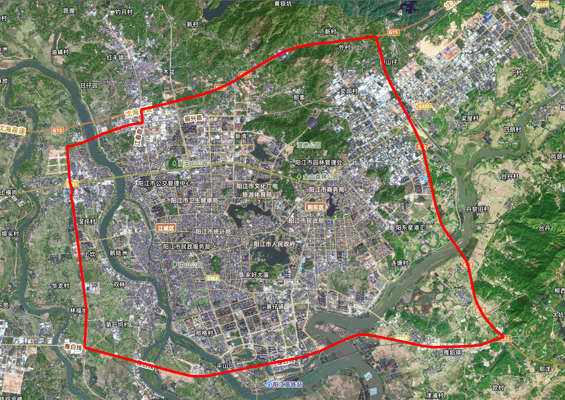 西部沿海高速(雅韶入口至沈海高速交匯處段)—沈海高速(西部沿海高速交匯處至創(chuàng)業(yè)北路交匯處段)—?jiǎng)?chuàng)業(yè)北路(沈海高速交匯處至G325交叉路口)—G325(創(chuàng)業(yè)北路交叉路口至中洲大道交叉路口)—中洲大道(G325交叉路口至雅白線交叉路口)—雅白線(中洲大道交叉路口至西部沿海高速雅韶入口)圍合的區(qū)域(不含邊界道路)。