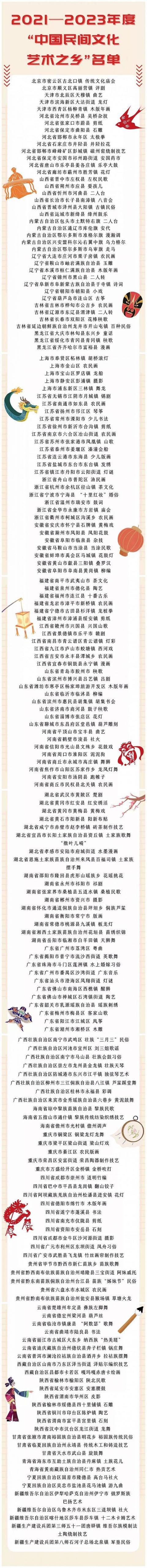 據文旅部網站消息,文化和旅游部發布關于命名2021—2023年度“中國民間文化藝術之鄉”的通知。為傳承中華優秀傳統文化,弘揚社會主義先進文化,豐富廣大人民群眾精神文化生活,文化和旅游部于2021年組織開展了2021—2023年度“中國民間文化藝術之鄉”評審命名工作。根據評審命名工作方案,經評審和公示,現決定命名北京市密云區古北口鎮等183個縣(市、區)、鄉鎮(街道)為2021—2023年度“中國民間文化藝術之鄉”。