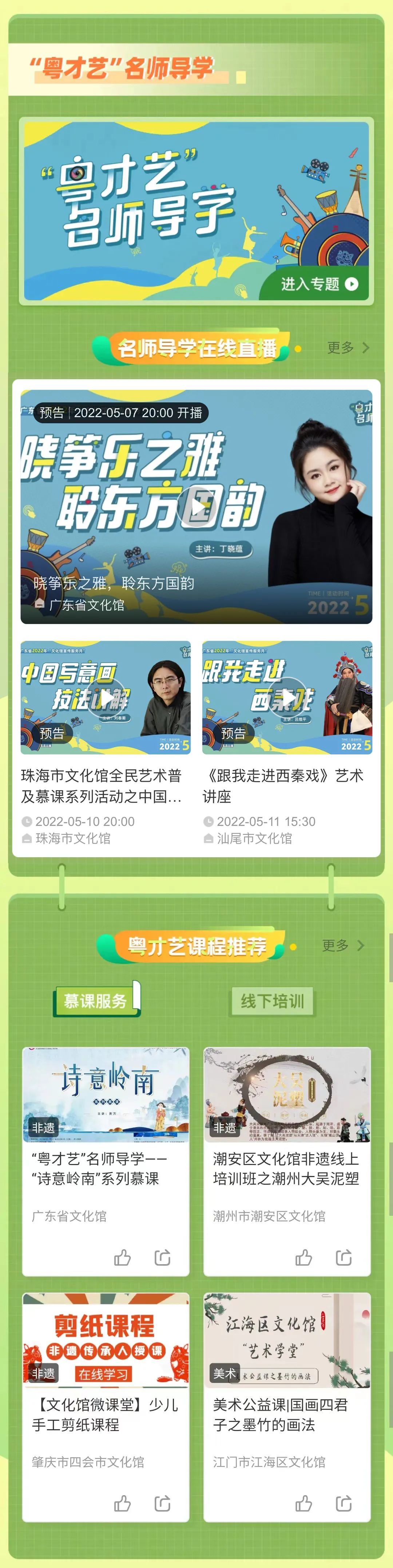 只需點擊進入廣東省2022年“文化館宣傳服務月”系列活動專題宣傳頁面,就能將全省各地文化館場館信息、惠民服務資訊和優質數字資源等“一網打盡”,正可謂:足不出戶,盡覽全省文化館風采;動動手指,即可報名參與活動。
