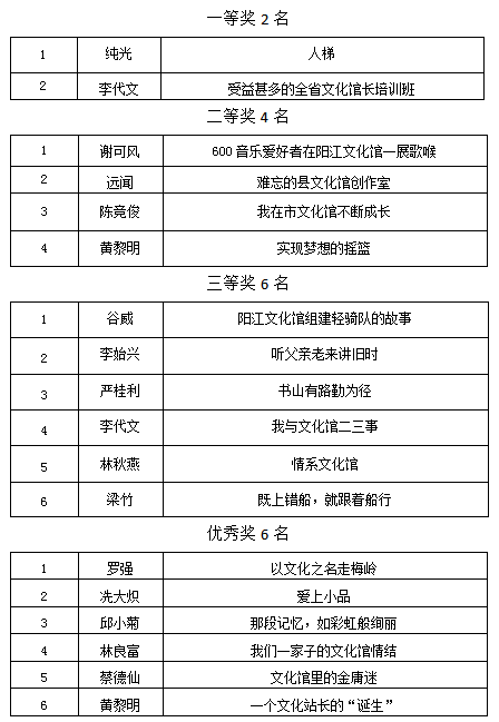 根據廣東省文化館聯盟關于2021年廣東“文化館宣傳服務月”系列活動的部署,陽江市文化館于5月15日至28日舉辦了“我和我的文化館”征文評選活動。本次活動共收到來自各縣(市、區)作者的文學作品25件,經過專家的認真評審,評選出一等獎2件,二等獎4件,三等獎6件,優秀獎6件(共18件),獲獎名單公布如下: