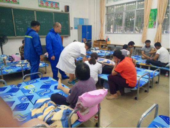 ▲東平鎮(zhèn)衛(wèi)生院醫(yī)務(wù)人員為避護(hù)所里的群眾提供醫(yī)療救助