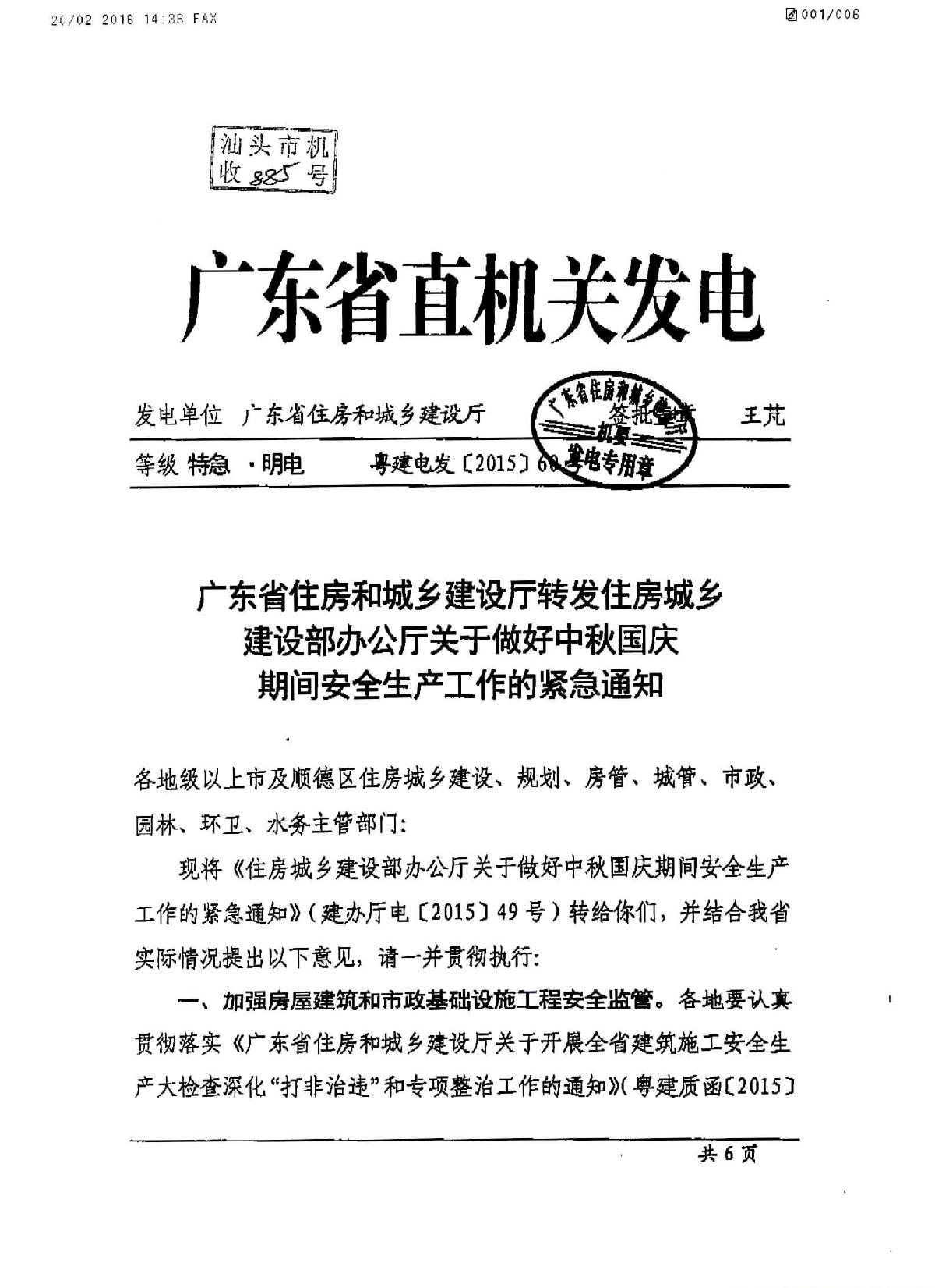 現(xiàn)將《廣東省住房和城鄉(xiāng)建設(shè)廳轉(zhuǎn)發(fā)住房城鄉(xiāng)建設(shè)部辦公廳關(guān)于做好中秋國慶期間安全生產(chǎn)工作的緊急通知》(粵建電發(fā)﹝2015﹞60號(hào))轉(zhuǎn)發(fā)給你們,請(qǐng)遵照?qǐng)?zhí)行。