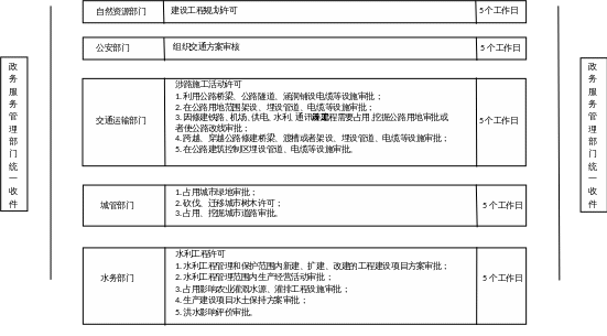 (三)實行并聯審批,提高行政效率。推行“一窗式”服務,實現統一受理、容缺受理、并聯審批、實時流轉,對審批事項、審批環節、審批節點進行全過程跟蹤督辦,由政務服務管理部門統一受理業務,推送至對應政府審批部門并匯總審批結果。電力外線工程建設許可和施工許可涉及自然資源、公安、交通運輸、城管綜合執法、水務等行政審批實行并行辦理,不互為前置條件。政府各部門并聯審批辦理總時限不超5個工作日,對于低壓電力外線接入工程采用備案制,實行免行政審批。具有獨立規劃審批權限的園區,政務服務數據管理部門將申請材料推送至相關園區按職能審批,參照以上時限要求完成審批。(責任單位:市政務服務數據管理局、自然資源局、公安局、交通運輸局、城管綜合執法局、水務局,各縣(市、區)政府,陽江供電局;流程見附錄)