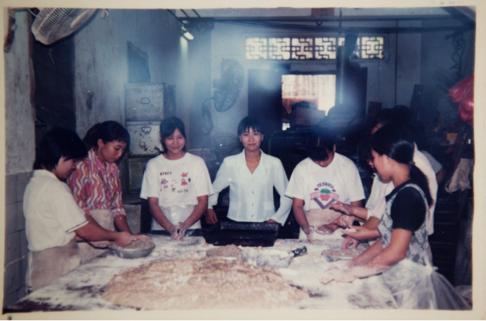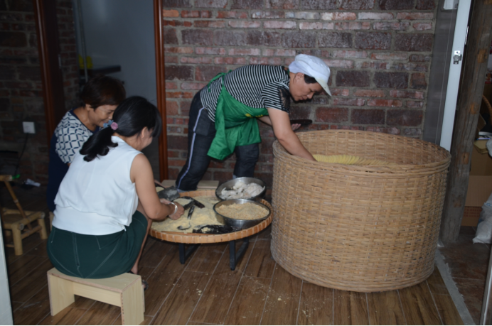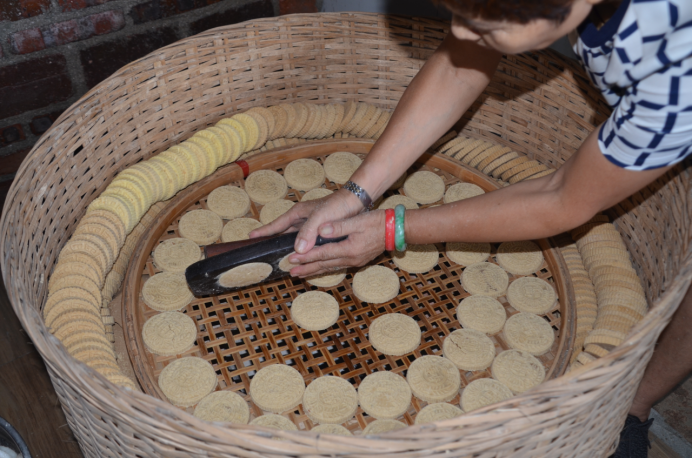 起焙裝缸,烘焙好的粉酥要及時起焙,將粉酥從烘爐中收起放到米缸中,此時要掌握好火候,火候太老會烘焦。隨爐讓炭火熄滅后再出爐,口味會更好,更具傳統風味。