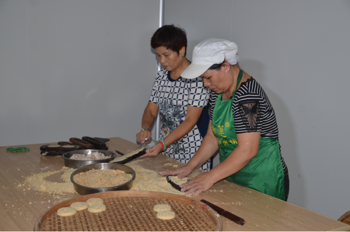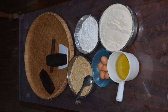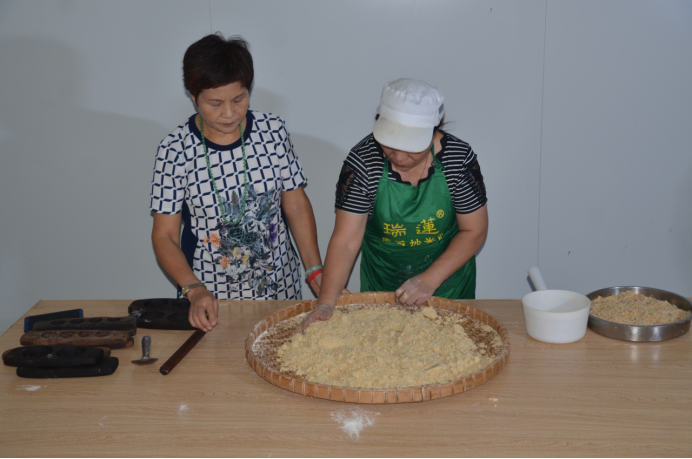 上印制作,將拌合好的粉料放到粉酥印中,在粉的中間加入花生、椰絲、白糖作餡,用粉覆蓋壓實,再用刀將多余的粉削掉,接著用貝殼粘上豬油(或鵝油)將粉酥磨平壓實,然后用木棍敲打脫模。