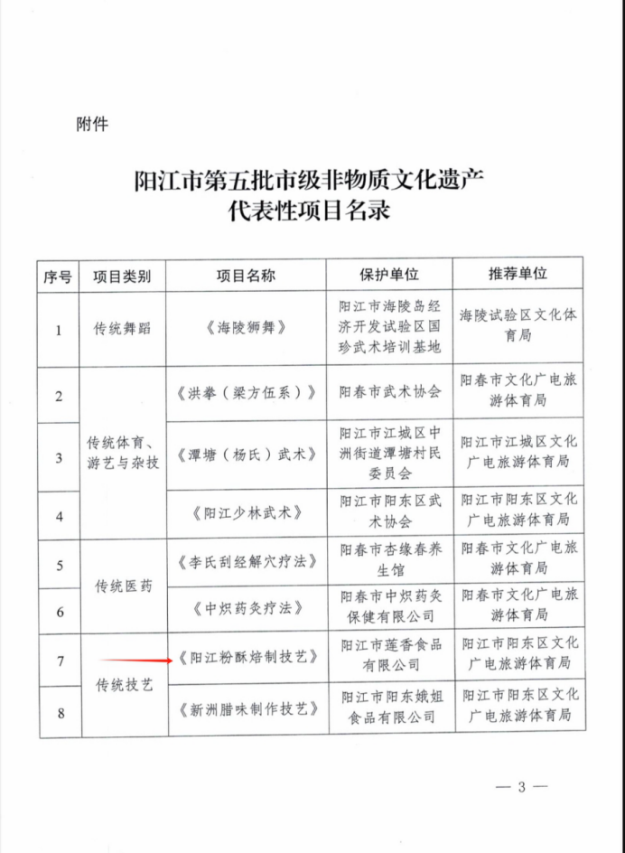 陽江粉酥焙制技藝是一項以炒米粉為主要材料,通過烘焙制作而成的一項傳統餅類食品制作技藝。由陽江人民在生活和習俗中產生、傳承和發展。陽江粉酥焙制技藝有選料、炒米、磨粉、配料拌合、上印制作、烘焙、起焙裝缸工序。